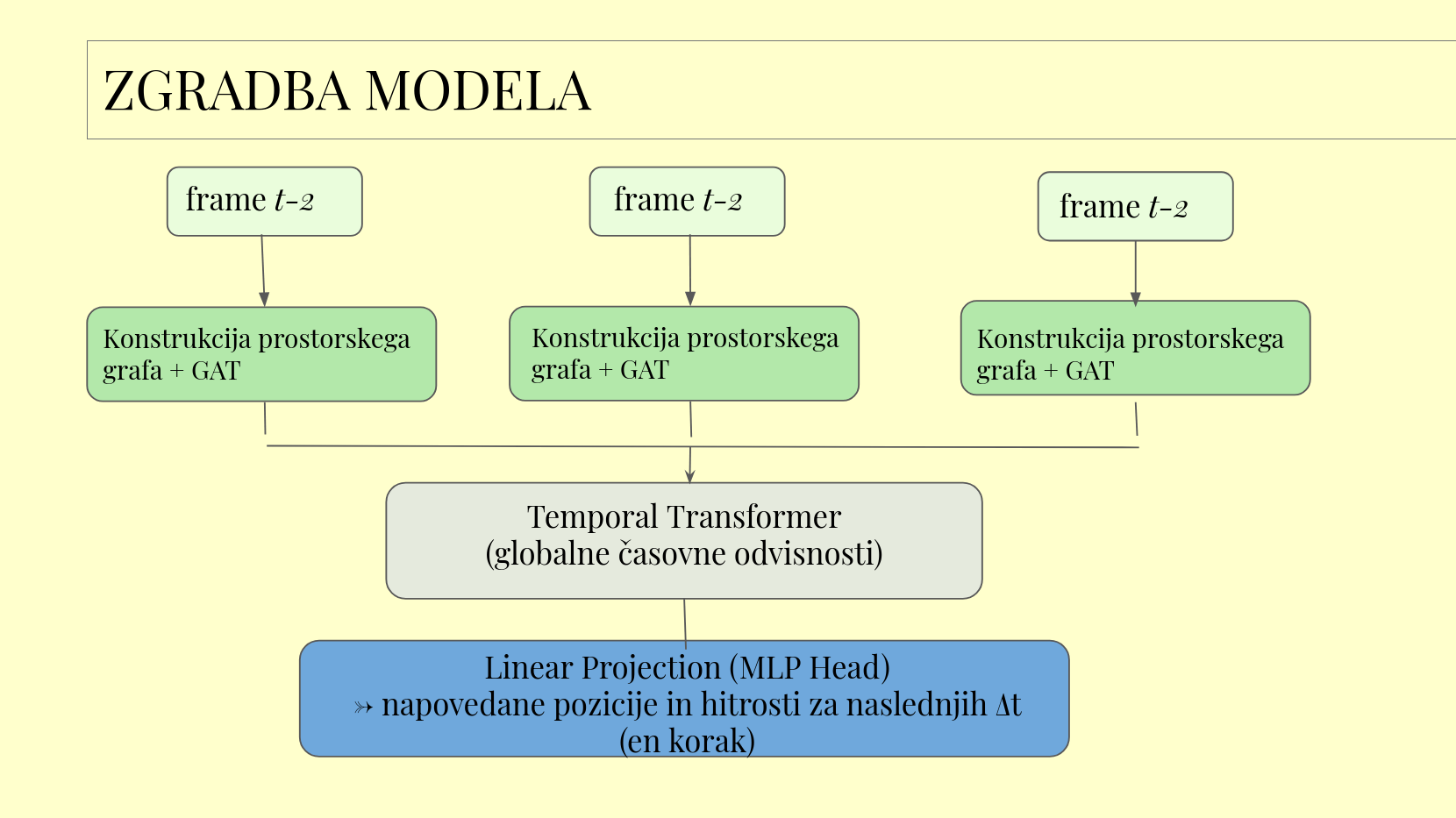 BONUS: Drugi del našega modela je transformer. Podobno kot transformerji gledajo npr zaporedje besed v povedi in poskušajo uganiti naslednjo, mi modeliramo odnose z zaporedjem. Pri tem uporabljamo self-attention mehanizem, pri čemer vsak element v zaporedju pogleda vse ostale in se nauči, kako pomembni so zanj (podobno kot se pri stavku nauči, na katero besedo se npr nanaša nek zaimek ali pridevnik). Temporal (časovni) transformer obravnava zaporedne time frame (časovne korake) kot zaporedje, kar omogoča našemu modelu da se nauči, kako prejšnja stanja jate rib vplivajo na prihodnje obnašanje.